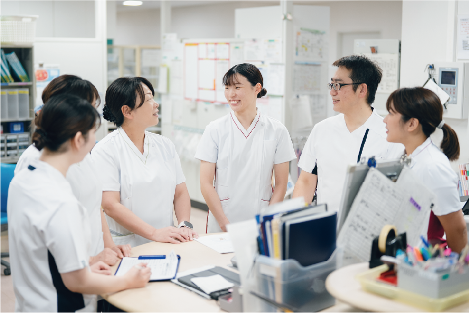 『やさしさとぬくもりのある質の高い医療の実践』という理念の実現に向け 、『おもいやりの心』を大切に、チーム医療を推進しながら心豊かに患者さん主体の看護が提供できるよう取組んでいます。